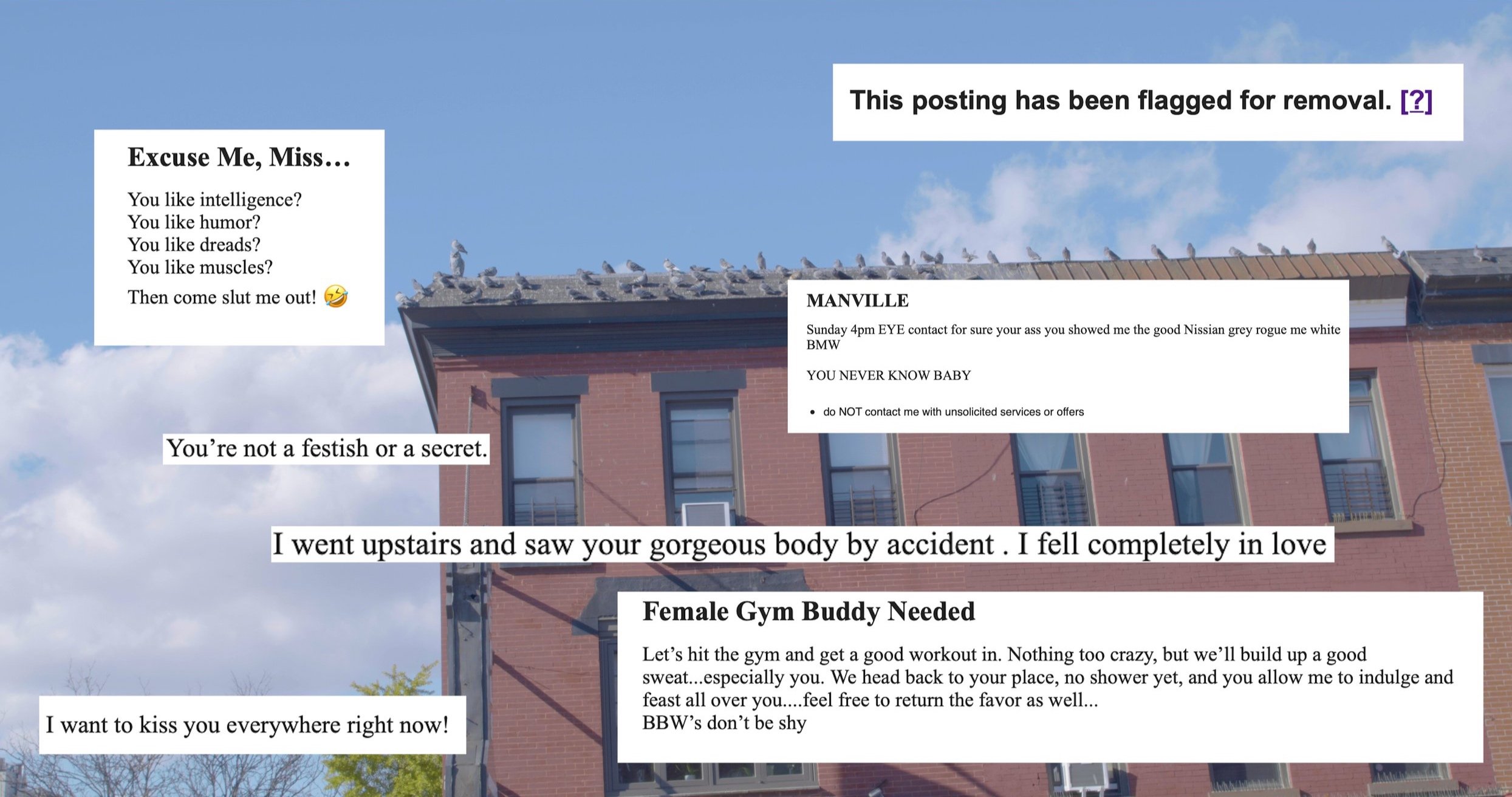 Desperately Seeking 2021, HD, Color, 10 min.A documentary on the Craigslist 'Missed Connections' section.